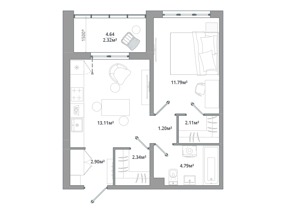 1-комнатная 42.33 м2